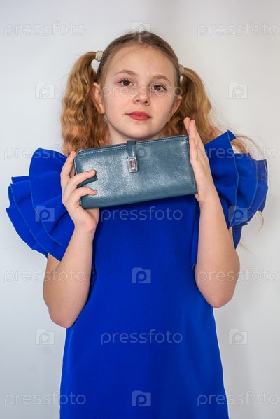 Красивая девочка модель в модном синем платье держит в руках кожаный кошелек. Портрет. 2025 A beautiful model girl in a fashionable blue dress holds a leather purse in her hands. Portrait. 2025