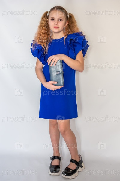 Красивая девочка модель в модном синем платье держит в руках кожаный кошелек. Портрет. 2025 A beautiful model girl in a fashionable blue dress holds a leather purse in her hands. Portrait. 2025