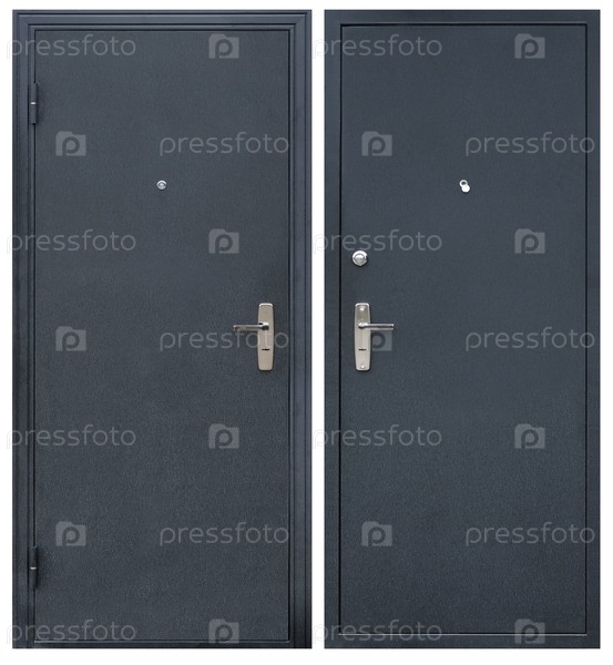 Модель входной металлической двери, изолированная на белом фоне: снаружи и изнутри