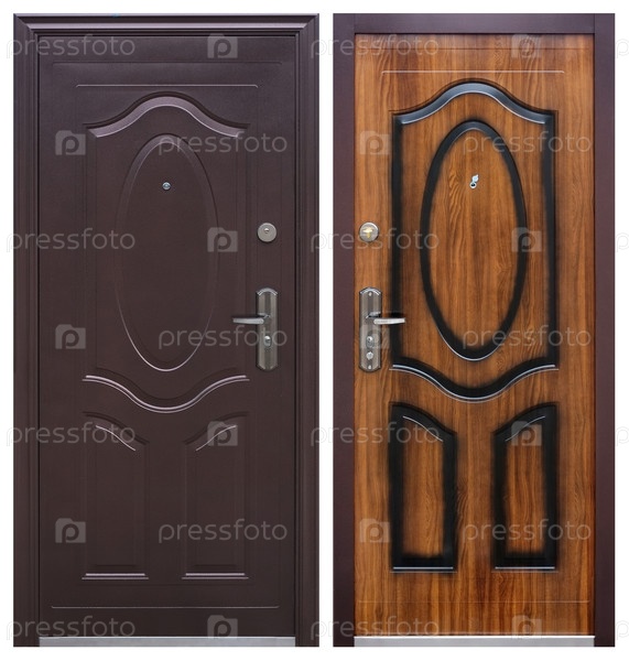 Модель входной металлической двери, изолированная на белом фоне: снаружи и изнутри
