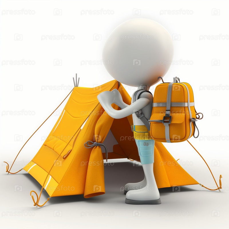 Стикмен устанавливает палатку, изолированный на белом фоне