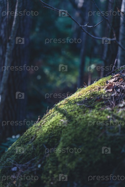 Покрытый мхом камень в тенистом лесу с пятнами солнечного света