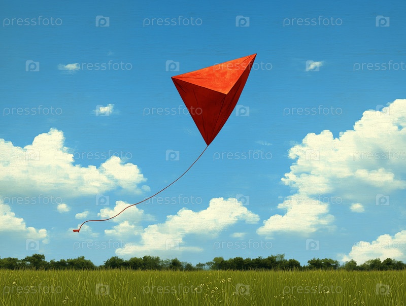 Красный воздушный змей летит в ясном голубом небе над зеленым полем