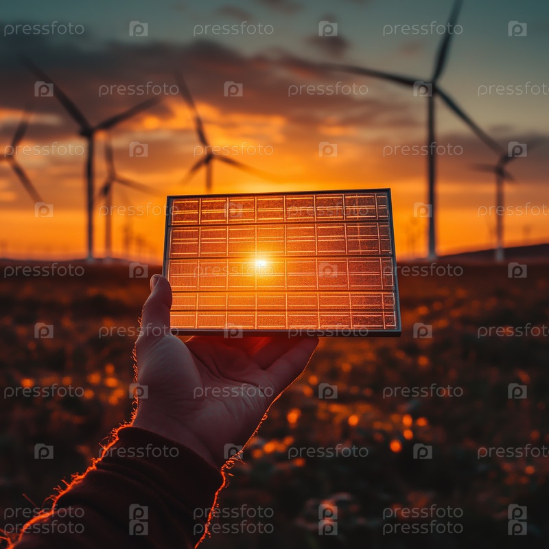 Рука держит солнечную панель с ветряными турбинами на золотом поле