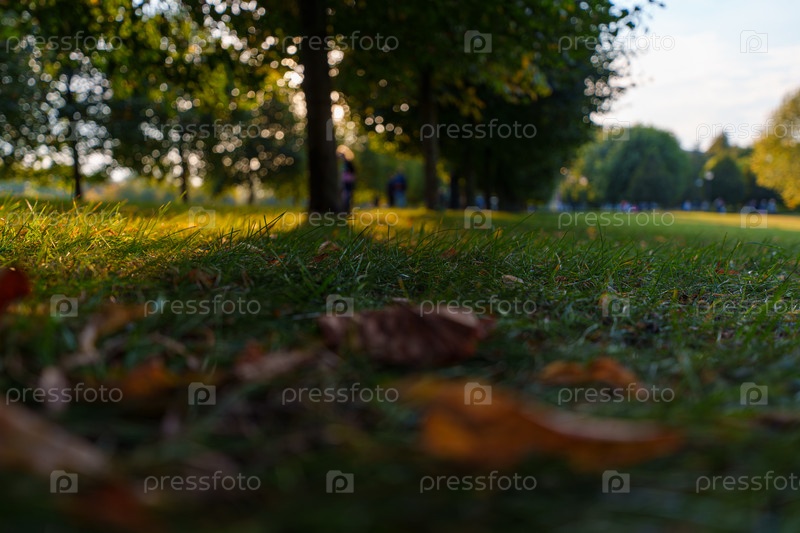 Осенние листья на травянистой лужайке на закате в городском парке
