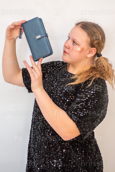 Красивая девочка модель в модном синем платье держит в руках кожаный кошелек. Портрет. 2025 A beautiful model girl in a fashionable blue dress holds a leather purse in her hands. Portrait. 2025