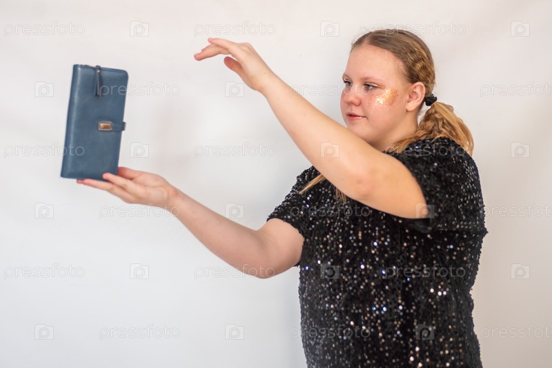 Красивая девочка модель в модном синем платье держит в руках кожаный кошелек. Портрет. 2025 A beautiful model girl in a fashionable blue dress holds a leather purse in her hands. Portrait. 2025