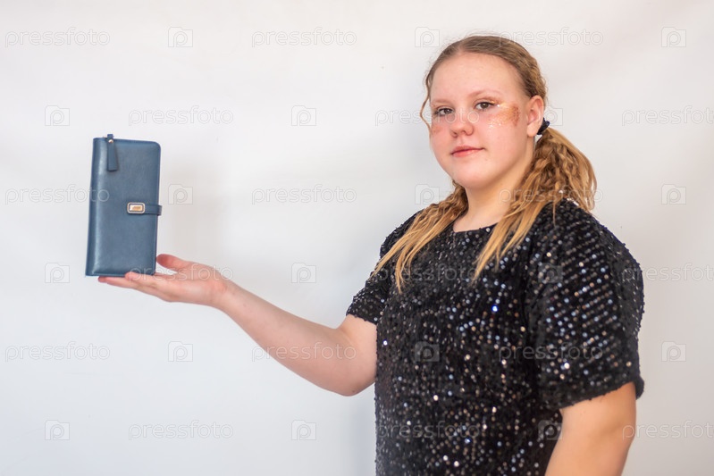 Красивая девочка модель в модном синем платье держит в руках кожаный кошелек. Портрет. 2025 A beautiful model girl in a fashionable blue dress holds a leather purse in her hands. Portrait. 2025
