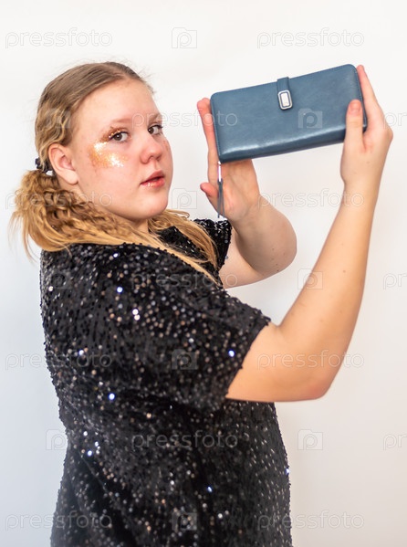 Красивая девочка модель в модном синем платье держит в руках кожаный кошелек. Портрет. 2025 A beautiful model girl in a fashionable blue dress holds a leather purse in her hands. Portrait. 2025