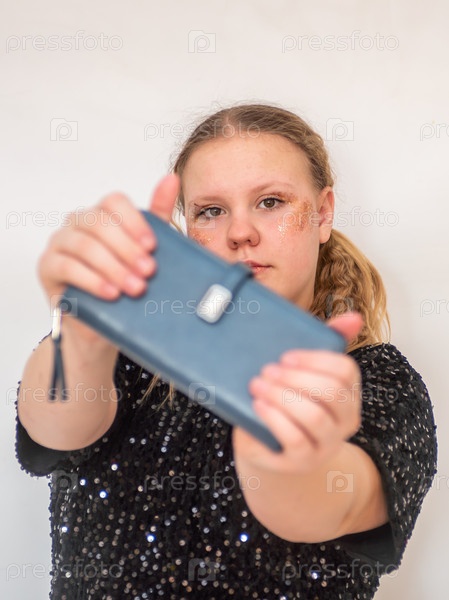 Красивая девочка модель в модном синем платье держит в руках кожаный кошелек. Портрет. 2025 A beautiful model girl in a fashionable blue dress holds a leather purse in her hands. Portrait. 2025