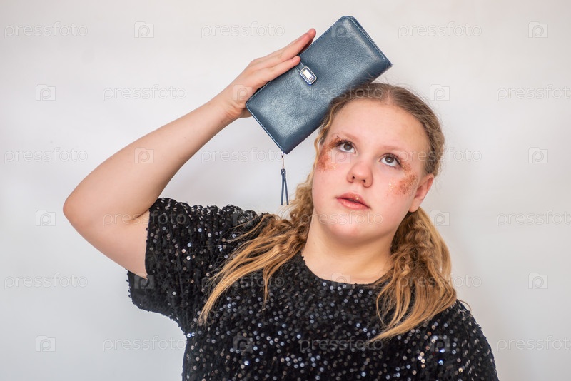 Красивая девочка модель в модном синем платье держит в руках кожаный кошелек. Портрет. 2025 A beautiful model girl in a fashionable blue dress holds a leather purse in her hands. Portrait. 2025
