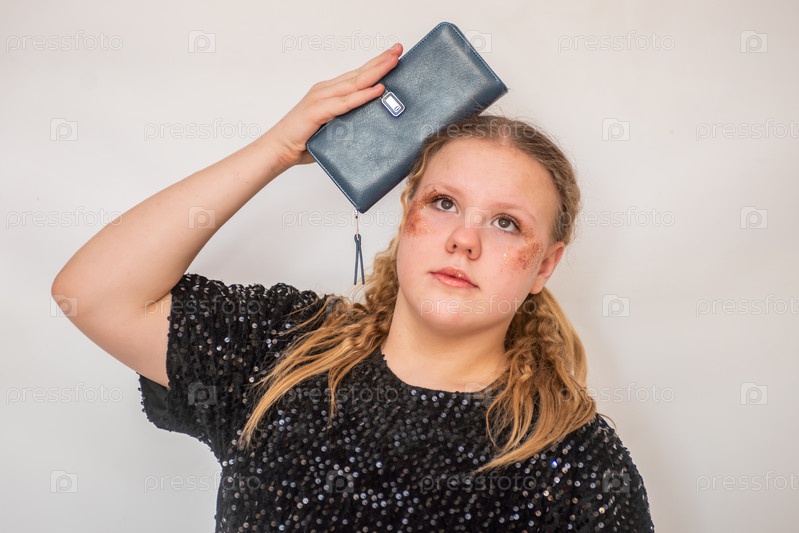 Красивая девочка модель в модном синем платье держит в руках кожаный кошелек. Портрет. 2025 A beautiful model girl in a fashionable blue dress holds a leather purse in her hands. Portrait. 2025