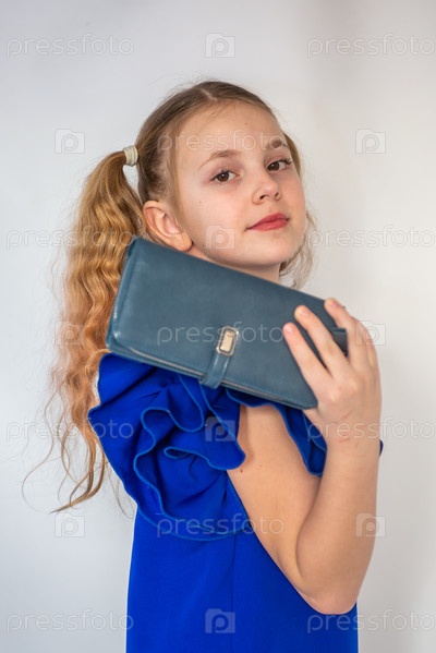 Красивая девочка модель в модном синем платье держит в руках кожаный кошелек. Портрет. 2025 A beautiful model girl in a fashionable blue dress holds a leather purse in her hands. Portrait. 2025