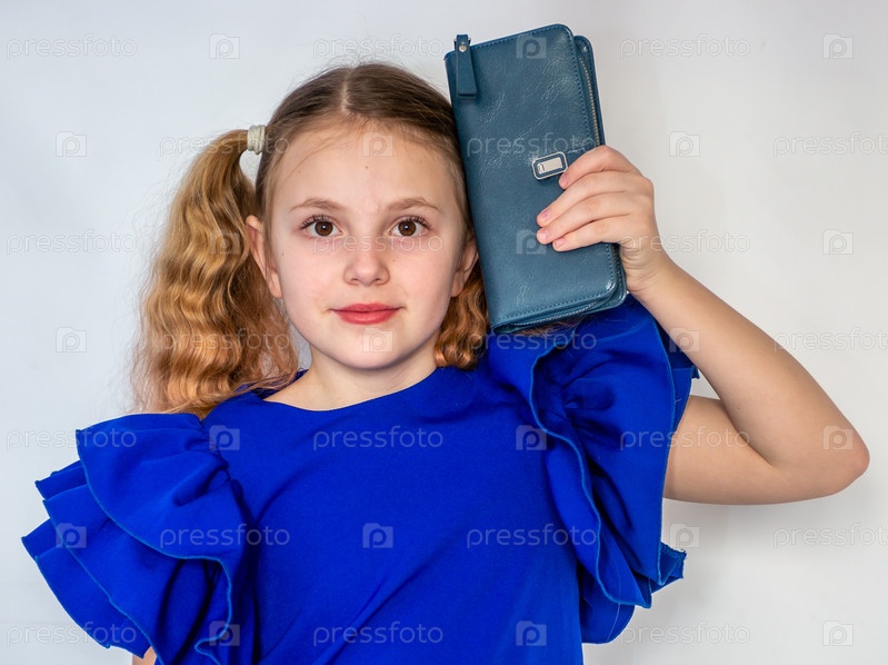Красивая девочка модель в модном синем платье держит в руках кожаный кошелек. Портрет. 2025 A beautiful model girl in a fashionable blue dress holds a leather purse in her hands. Portrait. 2025