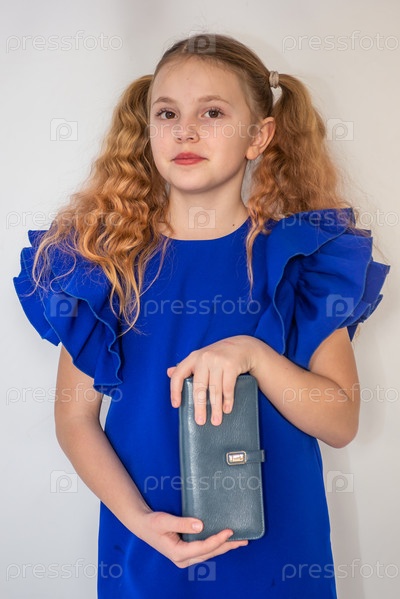 Красивая девочка модель в модном синем платье держит в руках кожаный кошелек. Портрет. 2025 A beautiful model girl in a fashionable blue dress holds a leather purse in her hands. Portrait. 2025