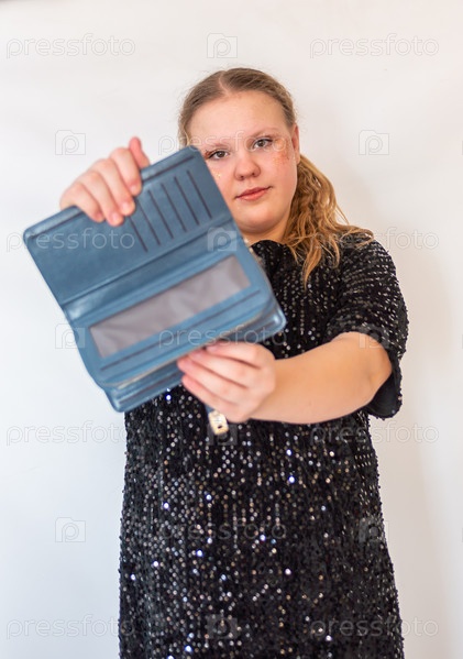 Красивая девочка модель в модном синем платье держит в руках кожаный кошелек. Портрет. 2025 A beautiful model girl in a fashionable blue dress holds a leather purse in her hands. Portrait. 2025