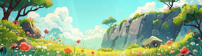 Летняя долина с цветами и деревьями. Панорамный рисунок