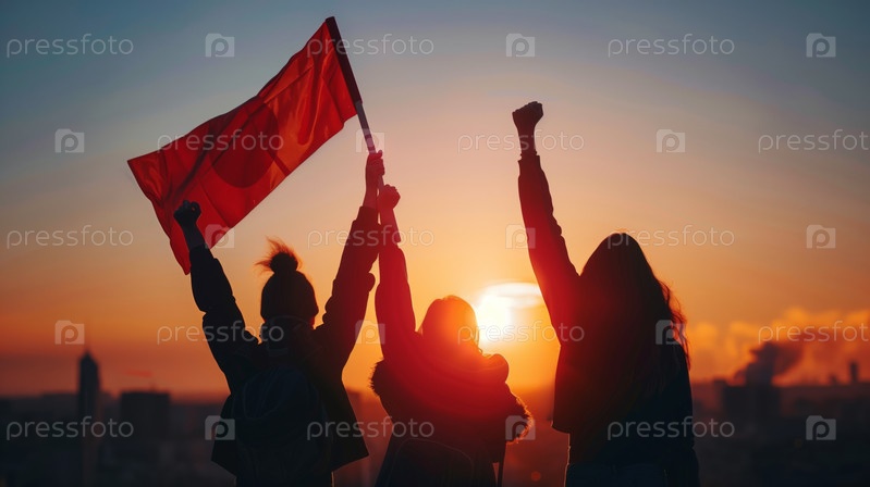 Активисты маршируют на закате с поднятым кулаком