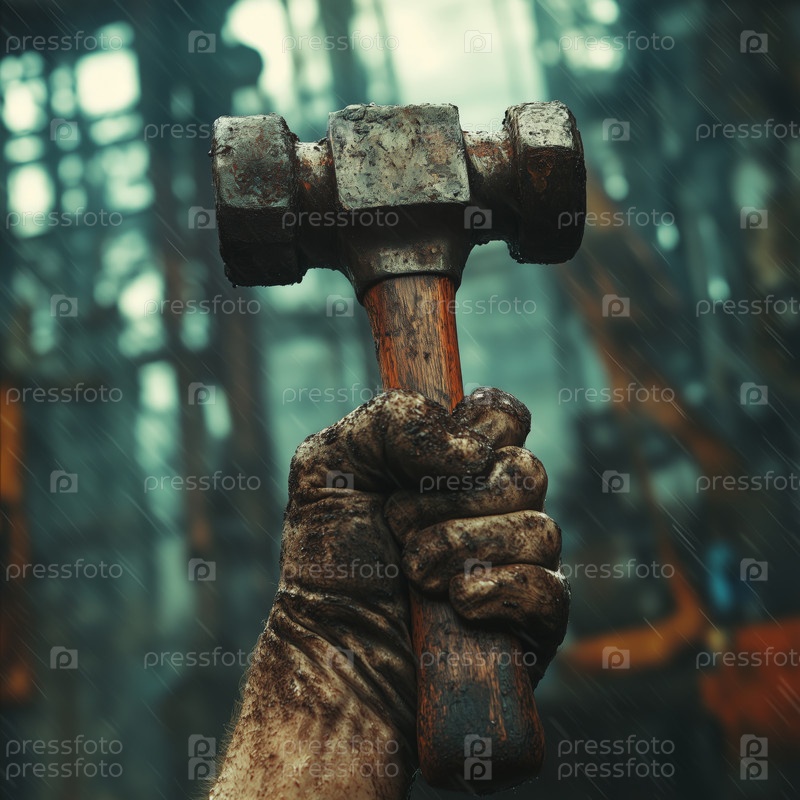 Поднятый молот на индустриальном фоне с дымом
