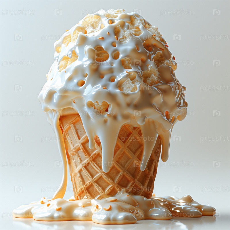 Растаявшее 3d мороженое в вафельном рожке. Сироп, крошки, карамель
