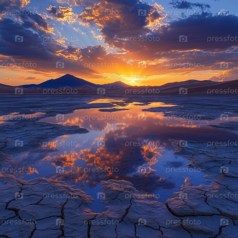Закат отражается в воде на потрескавшемся пустынном ландшафте