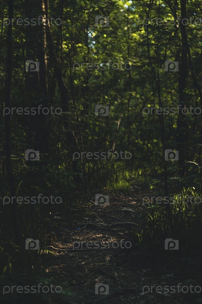 Тенистая лесная тропа, окруженная пышными зелеными деревьями