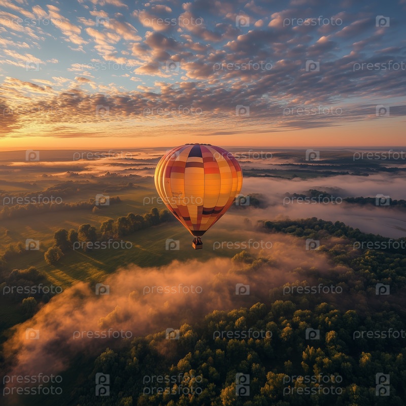 Воздушный шар, парящий над туманным пейзажем на рассвете