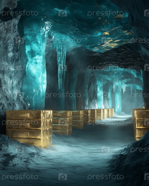 Подземное ледяное хранилище со штабелями золотых слитков