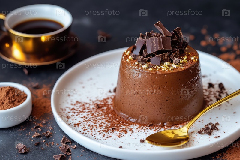 Этот десерт представляет собой идеально гладкий мусс из темного шоколада с глянцевой зеркальной глазурью, покрытый шоколадной стружкой, который подается на белой тарелке вместе с эспрессо и какао-порошком