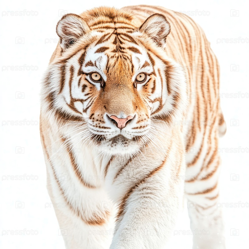 Величественный тигр стоит высоко и гордо, глядя в сторону с серьезным выражением. Композиция минималистична, подчеркивая королевский вид на строгом белом фоне