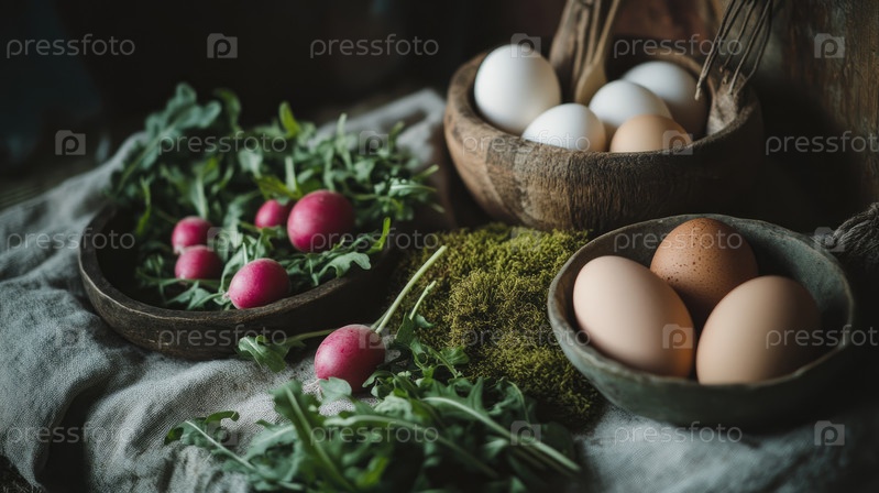 Коллекция свежих фермерских продуктов включает яйца, масляную редьку и рукколу, красиво разложенные на фактурном льне. Натуральные акценты мха усиливают деревенскую эстетику и винтажные тона