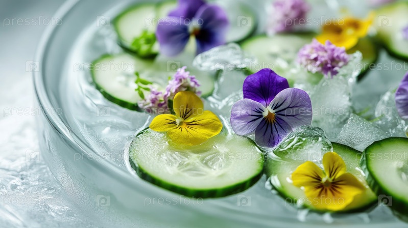 Нежные съедобные цветы плавают на ленточках огурцов, расположенных поверх кубиков льда в полупрозрачной тарелке, создавая освежающее и элегантное блюдо, идеально подходящее для изысканных встреч или кулинарных представлений