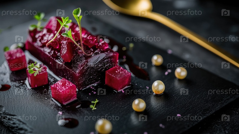 Пристальный взгляд на роскошную композицию из ферментированных кубиков сливы и свеклы в паре с жемчужинами комбучи. Подается на черной сланцевой тарелке с одной элегантной золотой ложкой, создавая изысканную атмосферу