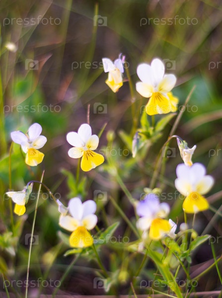 Фиалка полевая (лат. Víola arvénsis) на фоне разнотравья на летнем лугу