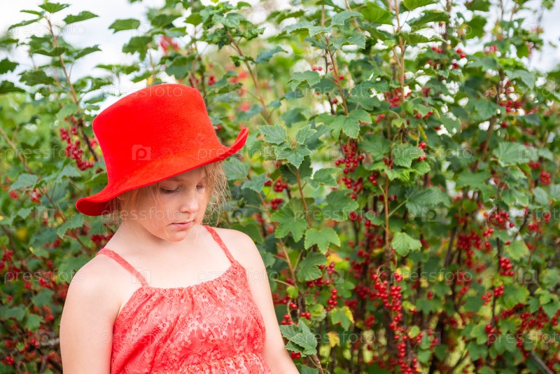 Девочка в красной шляпе возле куста красной смородины