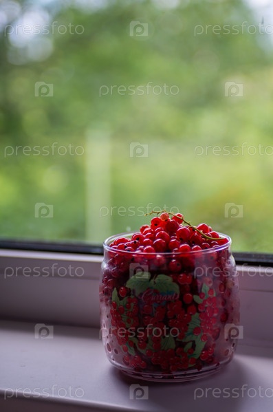 Собранная красная смородина в стеклянной прозрачной вазочке