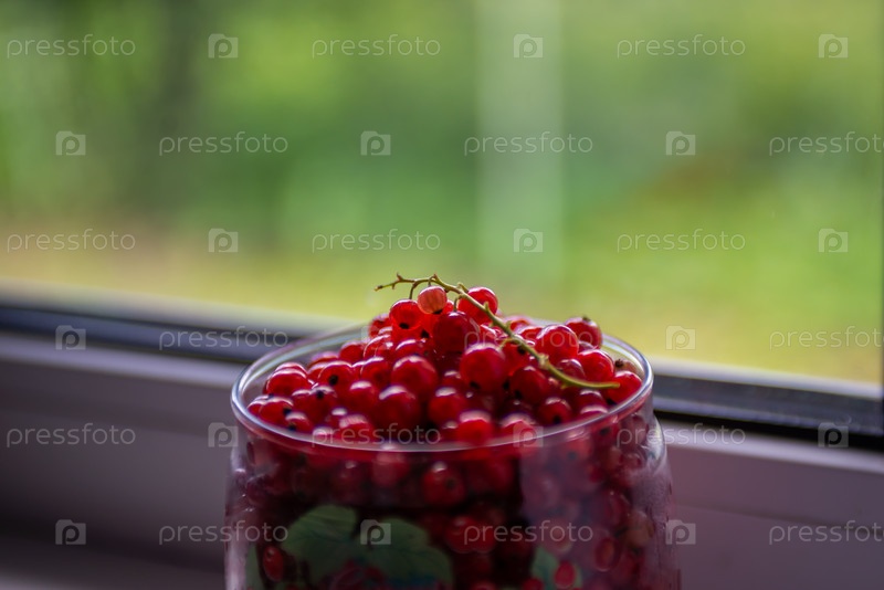 Собранная красная смородина в стеклянной прозрачной вазочке