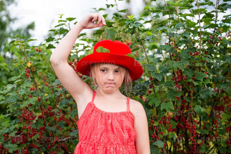 Девочка в красной шляпе возле куста красной смородины