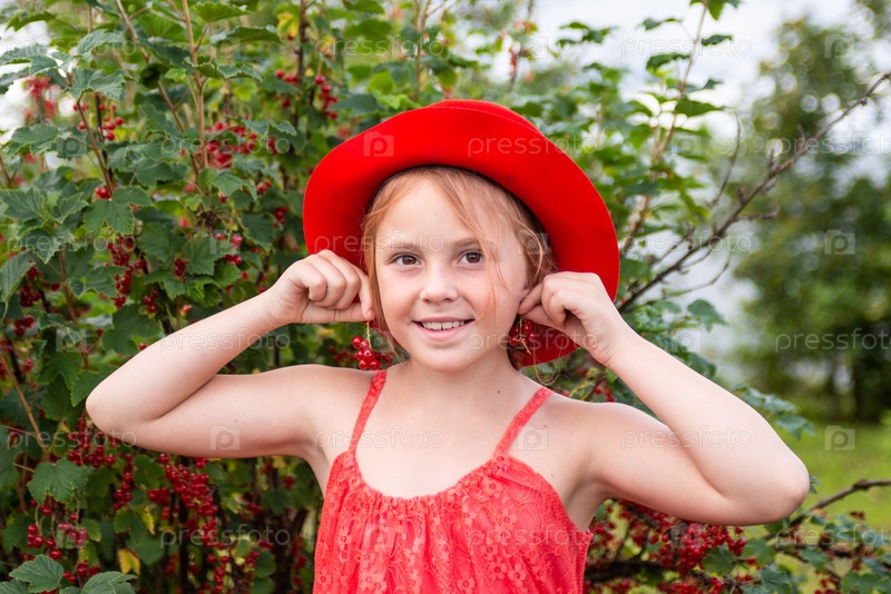 Девочка в красной шляпе возле куста красной смородины