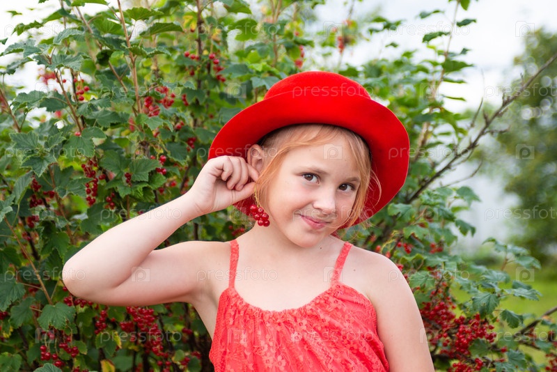 Девочка в красной шляпе возле куста красной смородины