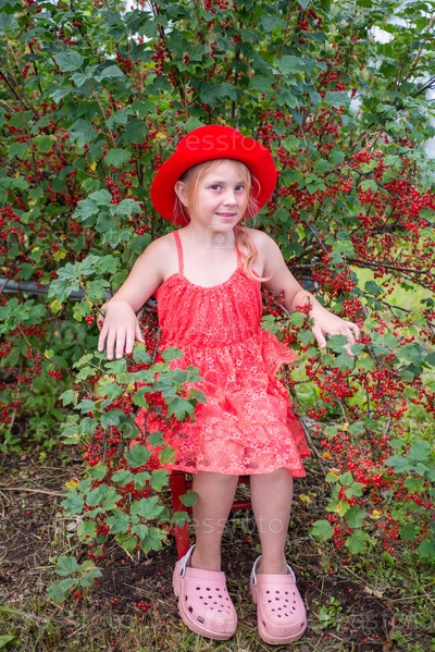 Девочка в красной шляпе возле куста красной смородины