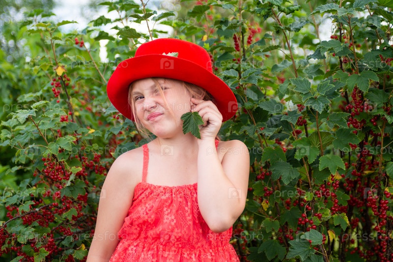 Девочка в красной шляпе возле куста красной смородины