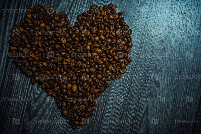 Сердце, выложенное из кофейных зерен на деревянном столе