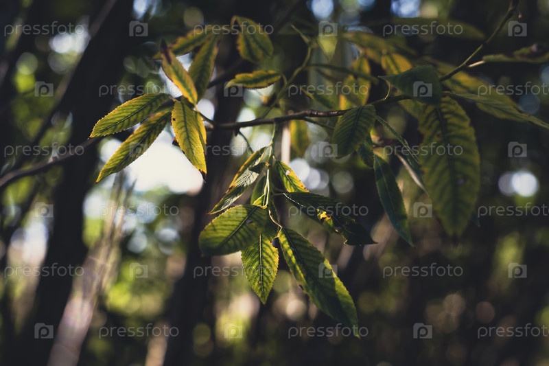 Освещенные солнцем листья свисают с ветки дерева в лесу