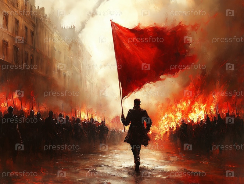 Одинокий протестующий с красным флагом возглавляет марш на фоне огненного городского пейзажа