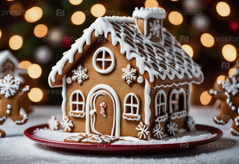 Праздничный пряничный домик красуется на тарелке, украшенный глазурью, конфетами и снежными украшениями. Он передает дух рождественской выпечки, окруженный радостной атмосферой. Генеративный ИИ