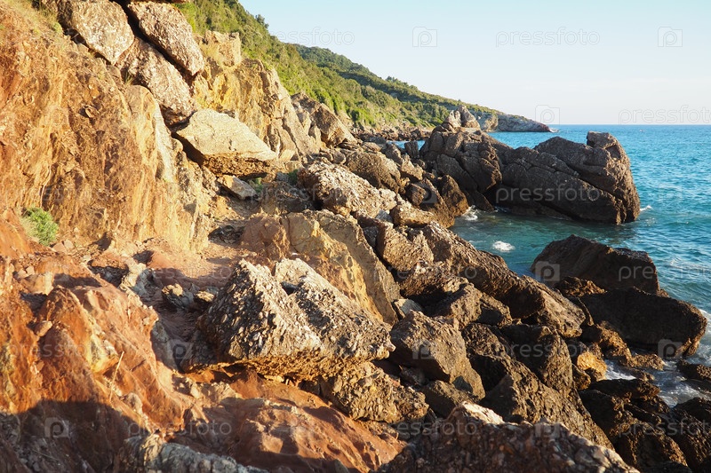 Волны мягко разбиваются о грубые скалы, пока солнце садится за горизонт. Ощутите безмятежную красоту этого прибрежного места, наполненного природными чудесами. Чань, Черногория, Адриатическое море