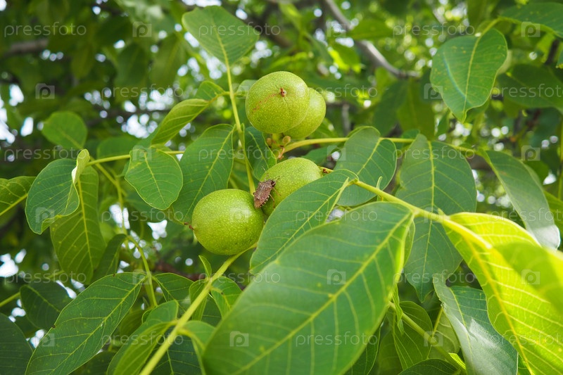 Juglans regia, персидский, английский, карпатский или мадейрский орех, обыкновенный орех. крупное листопадное дерево. Источники пищевых аллергенов. Листва и плоды крупным планом. Съедобный орех в саду