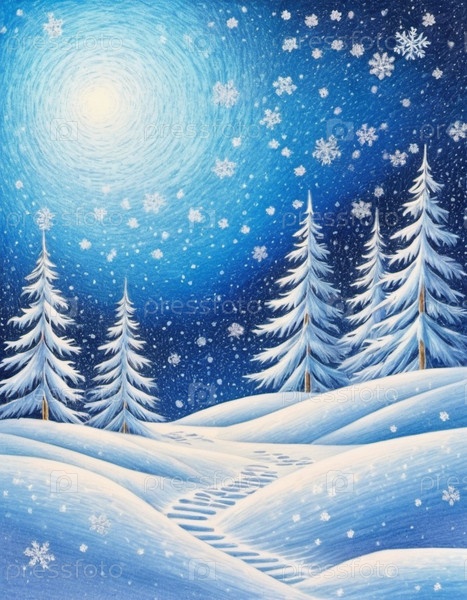 Живописная зимняя сцена с заснеженной равниной и силуэтами деревьев на фоне яркого ночного неба. Мягкий снегопад добавляет волшебный штрих, создавая спокойный и захватывающий дух пейзаж. Сгенерированный ИИ