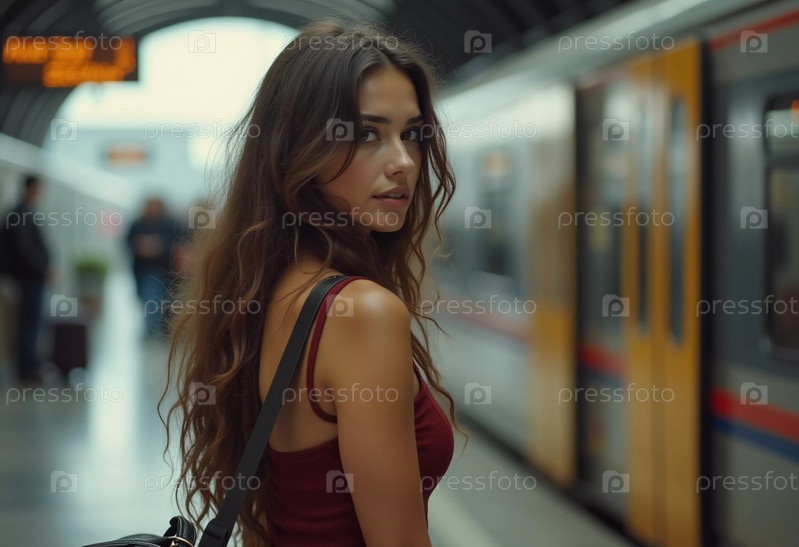 Девушка с волнистыми волосами стоит на вокзале, поворачиваясь, чтобы посмотреть в камеру, держа чемодан. Путешественники суетятся мимо нее, пока она ждет свой поезд. Красивая молодая женщина. Генеративный ИИ